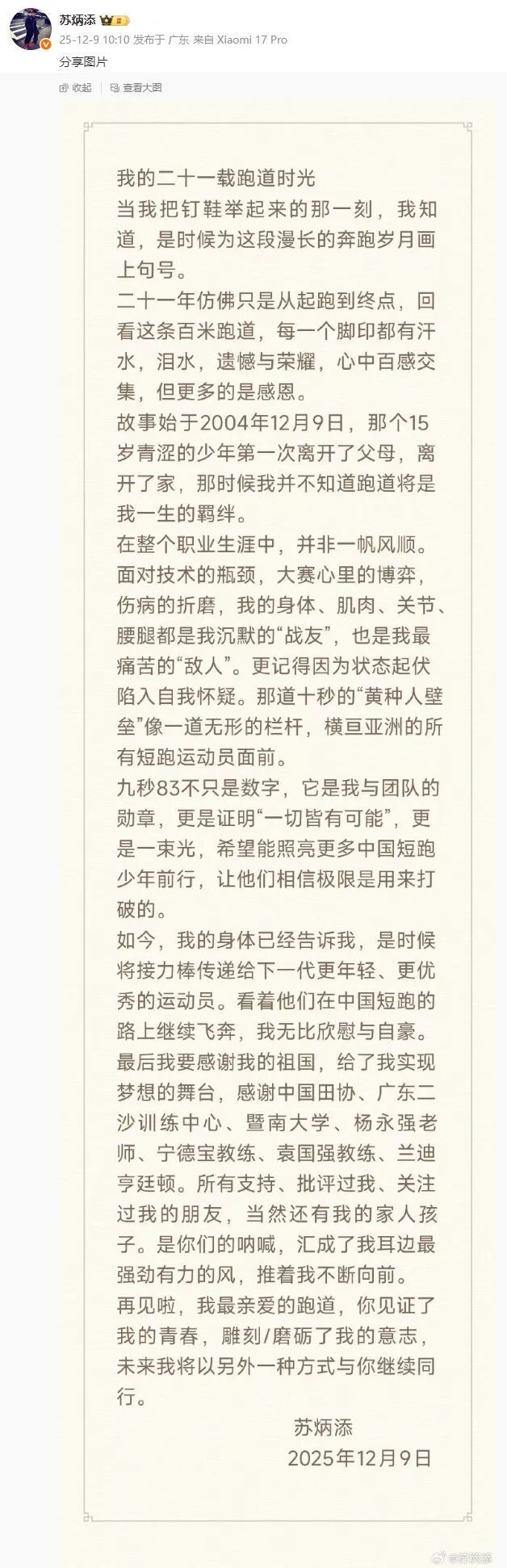 跑道有终点,但传承没有。从百米终点线转身,苏炳添正在奔向新的人生之路。
